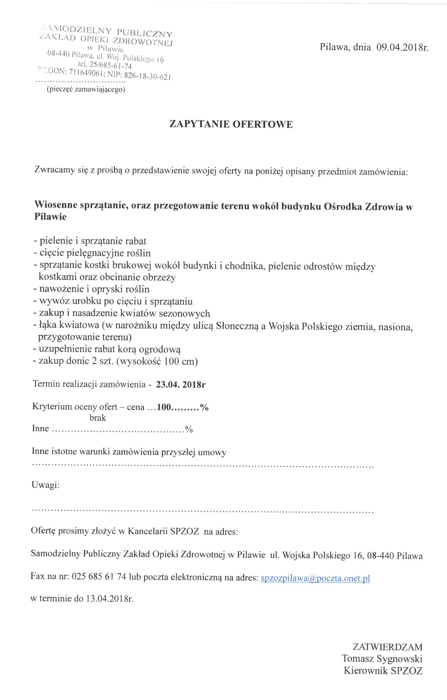 Zapytanie ofertowe na wiosenne sprzątanie oraz przygotowanie terenu wokół budynku Ośrodka Zdrowia w Pilawie