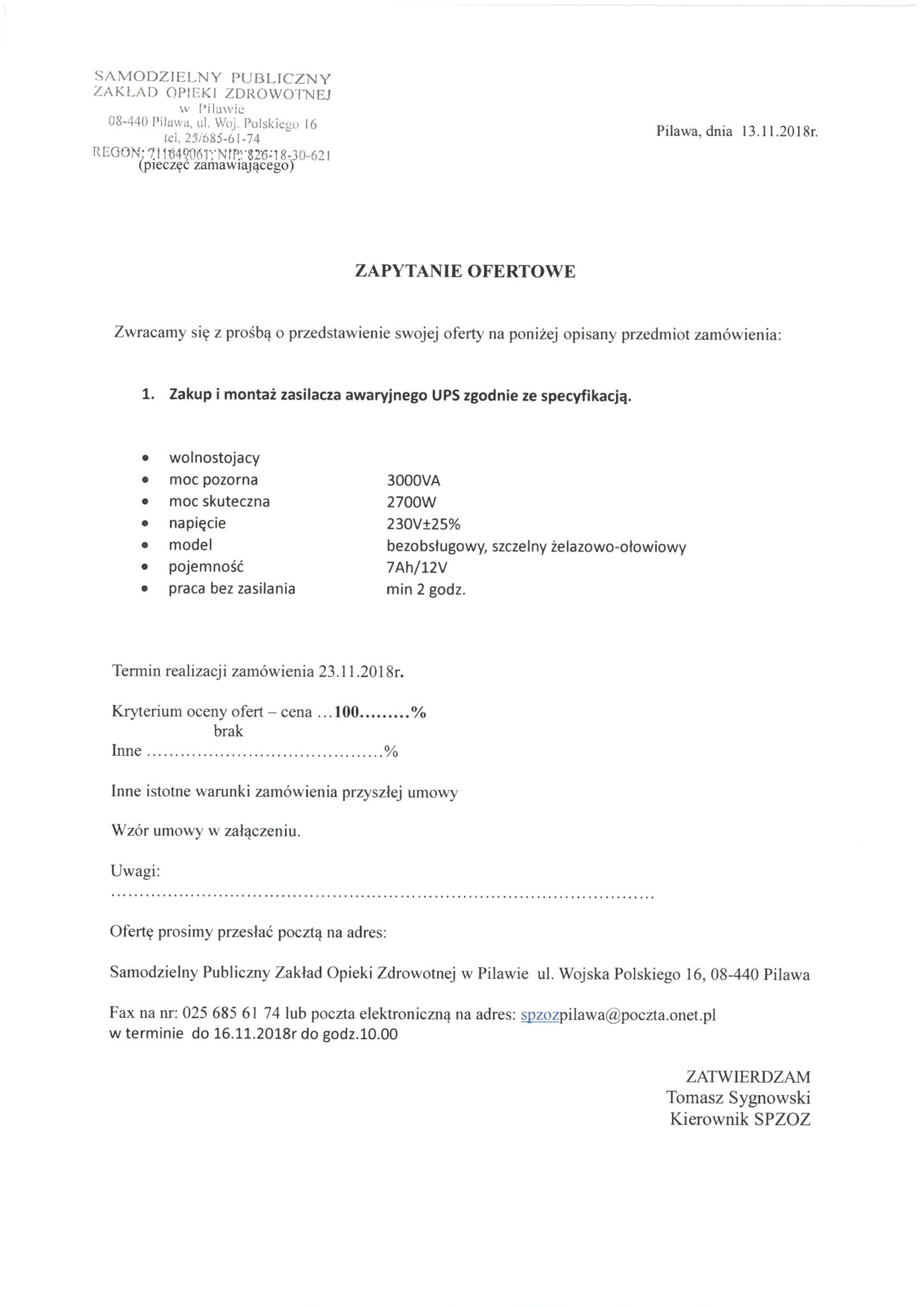 Zapytanie ofertowe na zakup i montaż zasilacza awaryjnego UPS