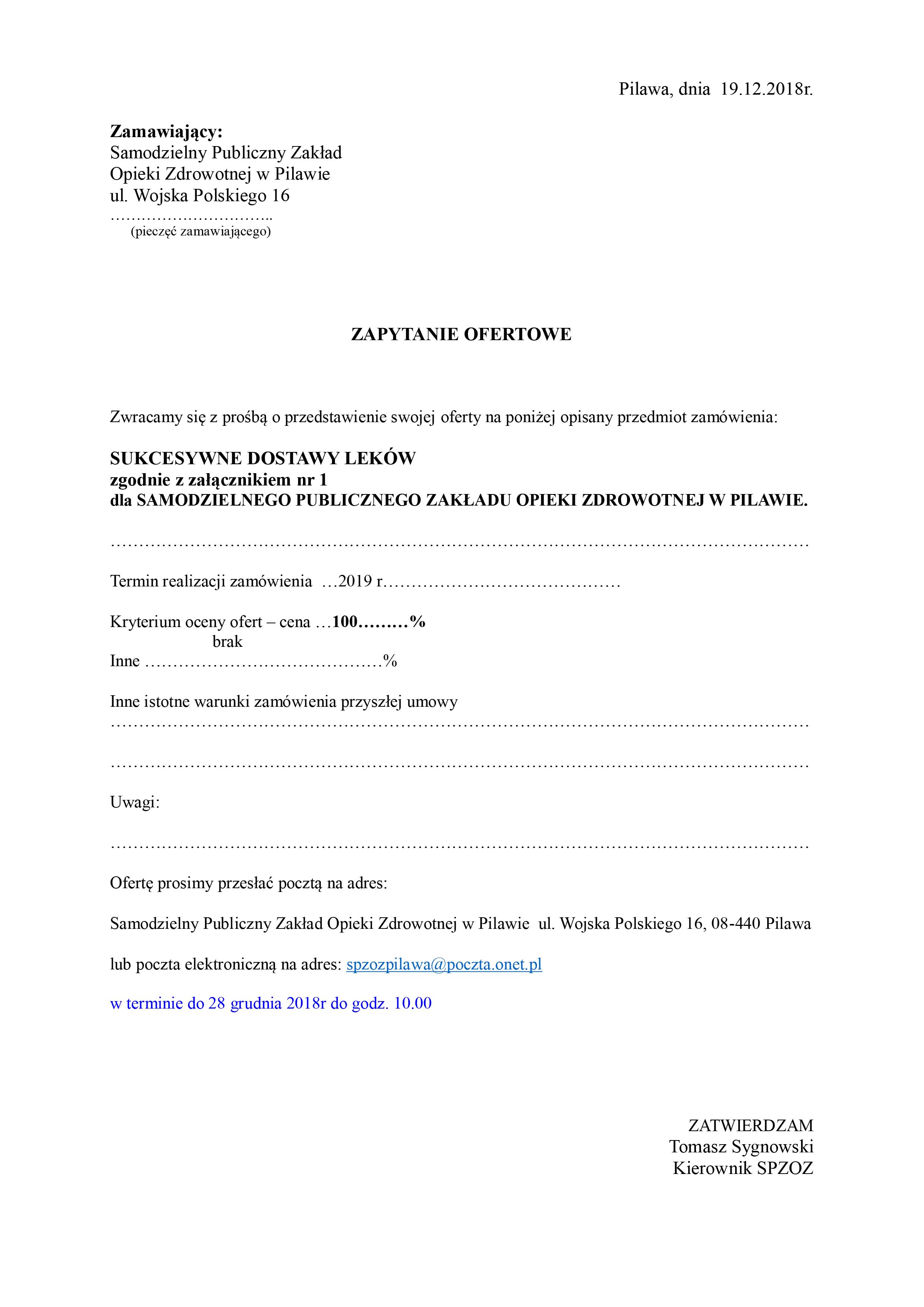 Zapytanie ofertowe na sukcesywne dostawy leków