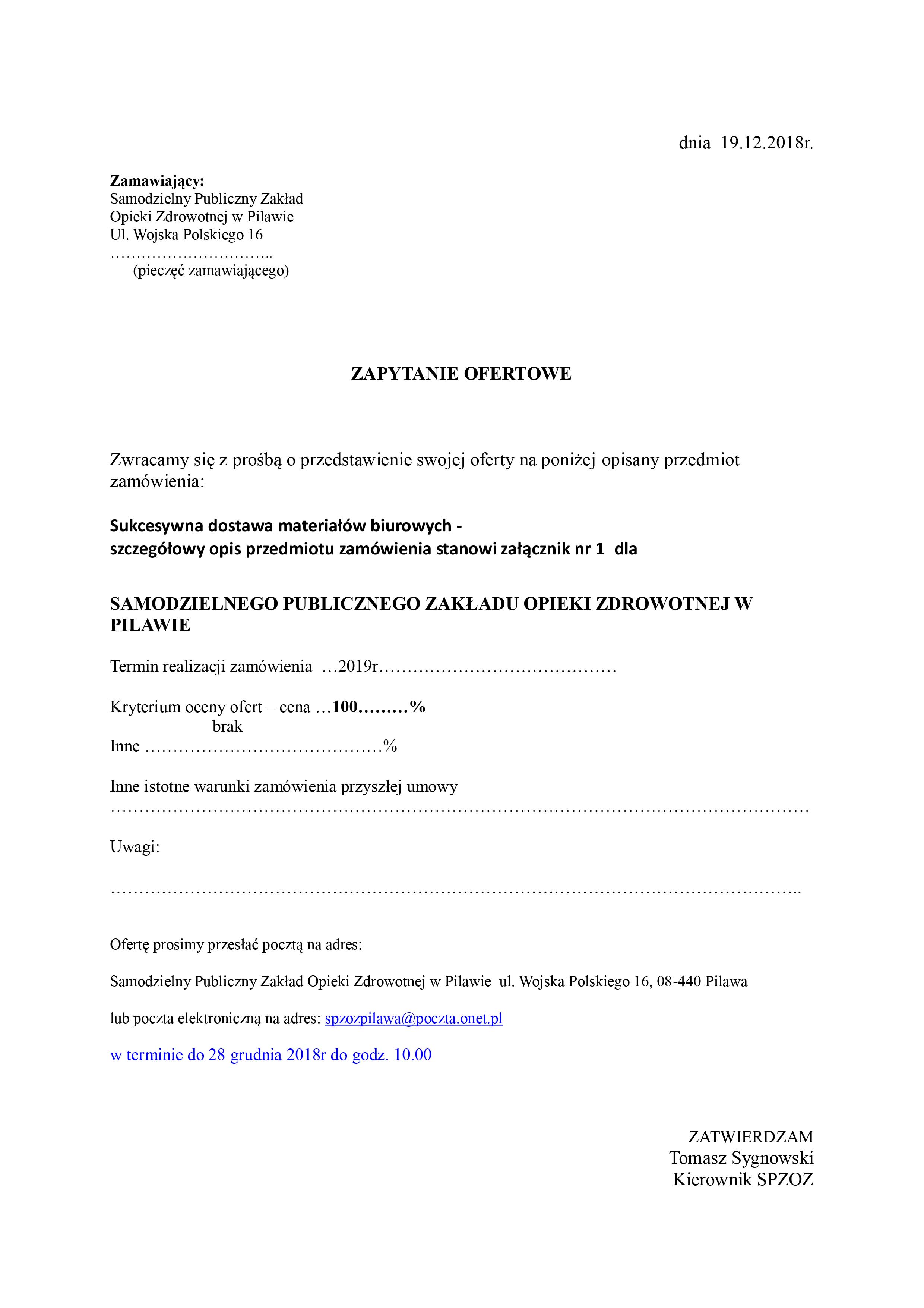 Zapytanie ofertowe na sukcesywną dostawę materiałów biurowych