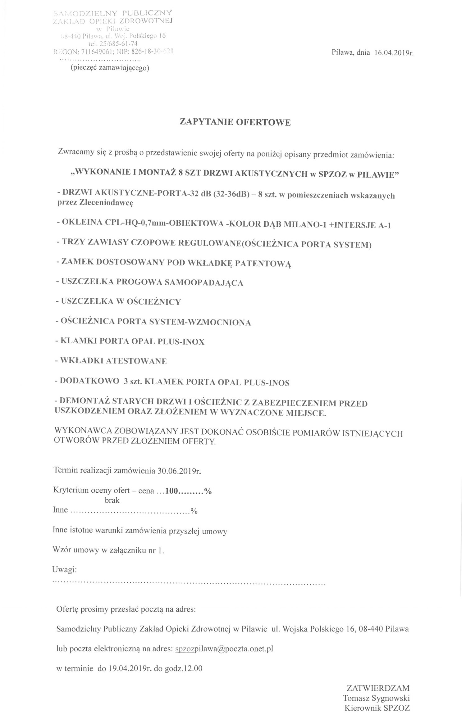 Zapytanie ofertowe na wykonanie i montaż drzwi akustycznych w SPZOZ w Pilawie