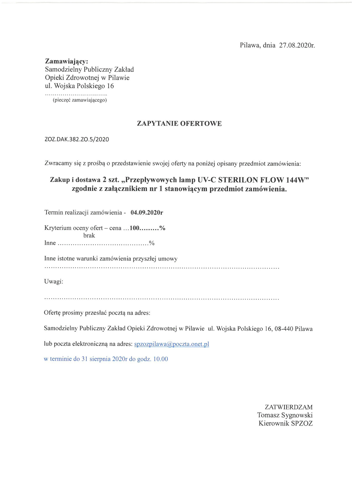 Zapytanie ofertowe na zakup i dostawę przepływowych lamp UV-C Sterilon Flow 144W